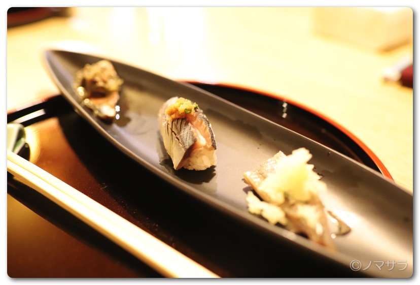 秋刀魚のオイルサーディン、スモーク、寿司の三種盛り。事前にスモークを作る工程を見させてもらってましたが、こんな味に仕上がるのかと感動しました。
