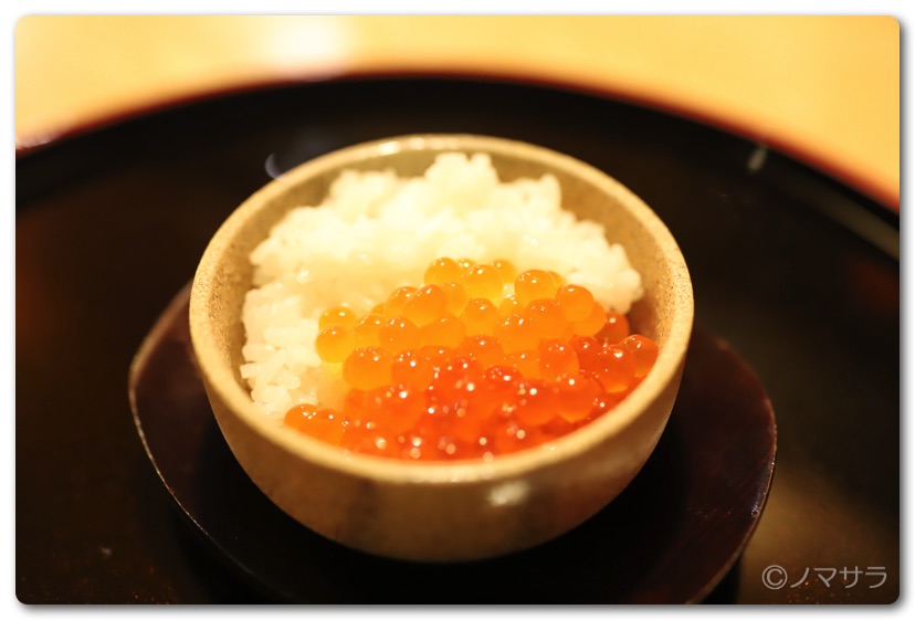 今回、16名中アルコールを飲まれるのは3名のみ。ワタクシも含めてゲコノミストが多かったので少しお腹を満たすミニイクラ丼を用意してくれました。「まるで宝石箱みたいや〜」(笑)