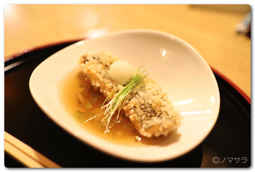 個人的には今回の料理の中で一番のお気に入り。ご飯を乾燥させたものを周りにまぶして揚げてありこれがパリパリでミニあられのような食感。松茸の餡掛けと相まって唸りまくり。