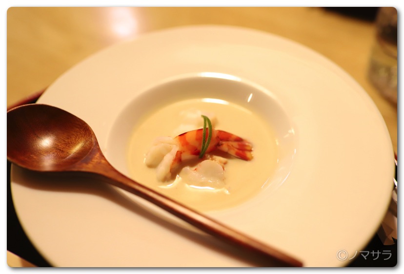 白味噌仕立ての利平栗のポタージュに添えた三河の天然車海老