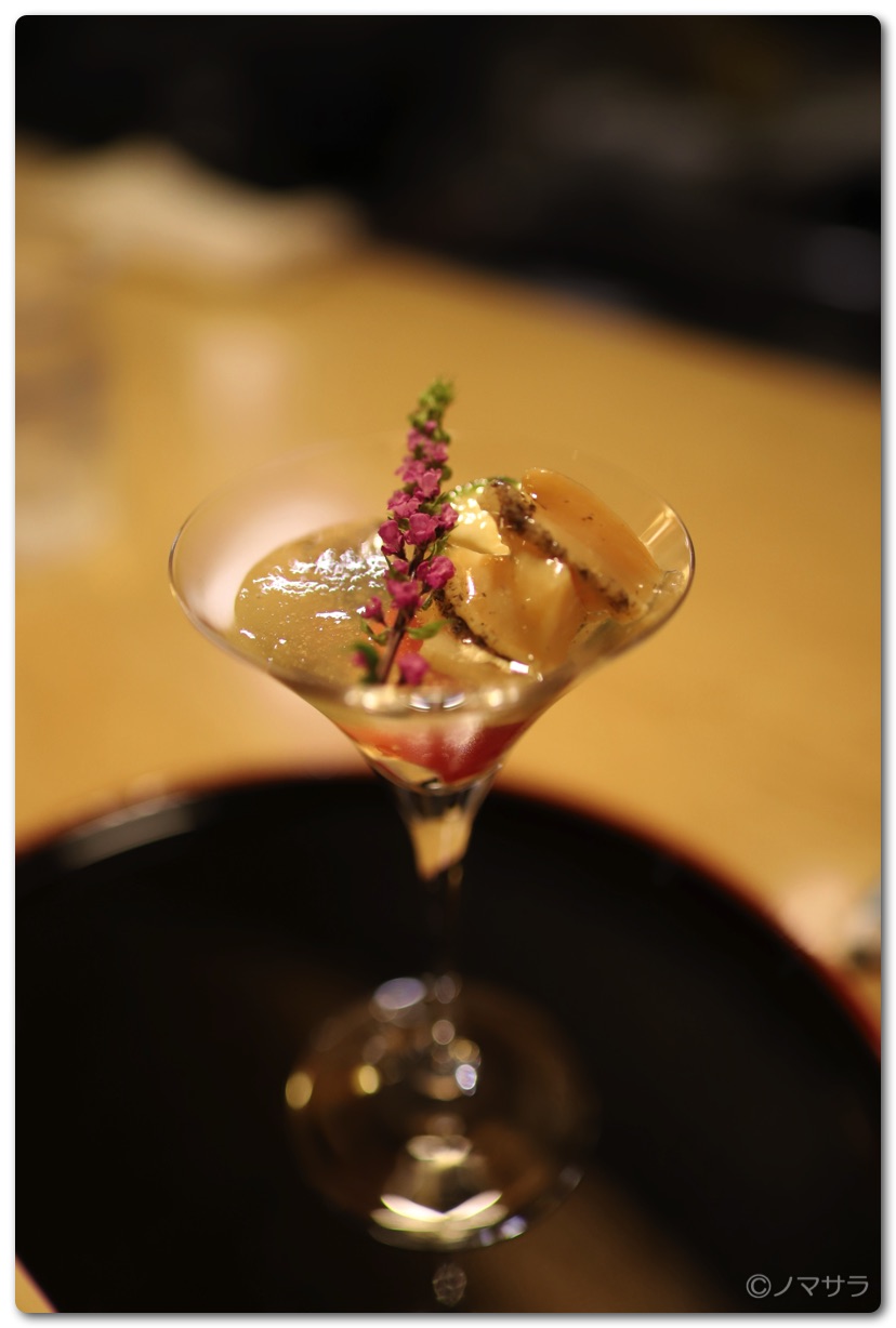 透明なトマトジュレと鮑の前菜