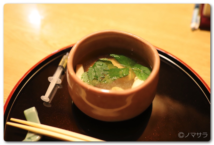 松茸のお吸い物はダシが完璧でいやはや幸せ幸せ。搾りたての胡麻油が注射器に入っており、途中でこれを入れると味変しまた違った味わいが楽しめます。胡麻油だけ舐めましたが、これだけでも十分旨かった(^^)