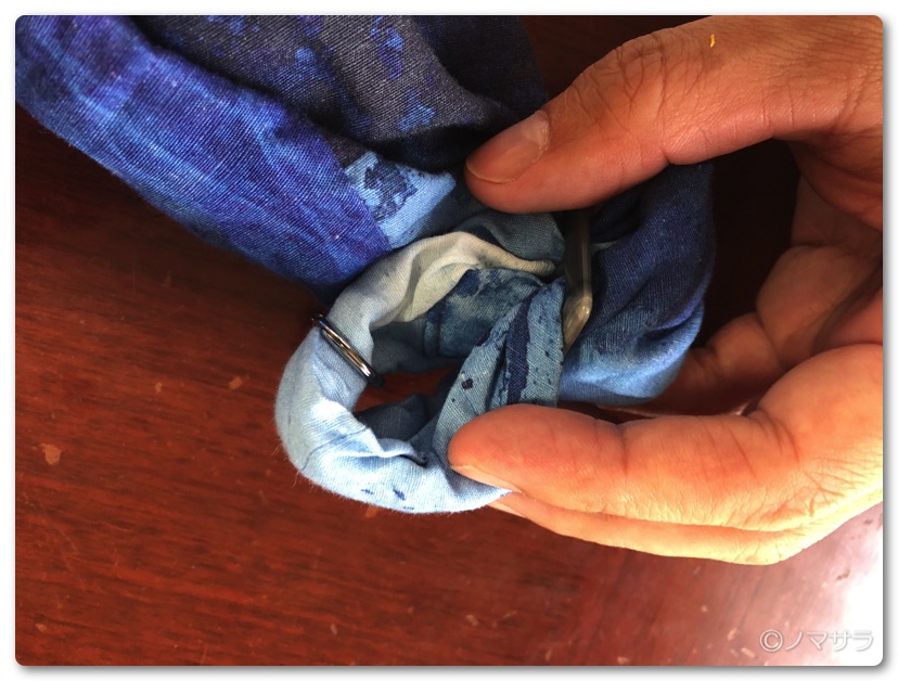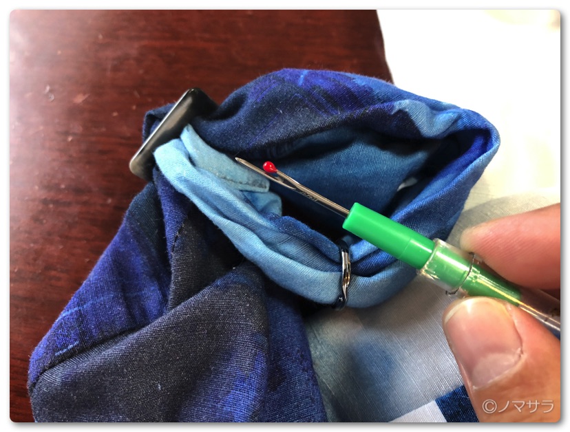そこにアンカーリンクスのアタッチメントを通します。裏表だけ間違えないように注意します。通したら先を留め具に通して元の状態に戻します。あとはまち針で位置を決めてミシンをかけるだけ。実家には本格的なミシンがあるため厚みのある生地ではありましたがしっかりとミシンがかかりました。もし、ミシンがない場合や厚くてミシンがかからない場合は手縫いするという方法もあります。母のおかげで見事に完成!