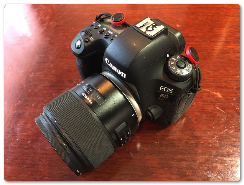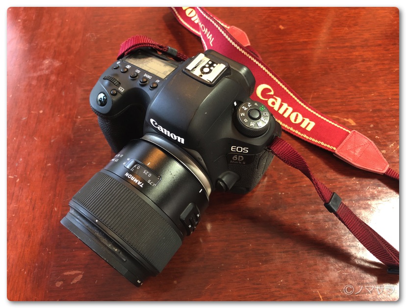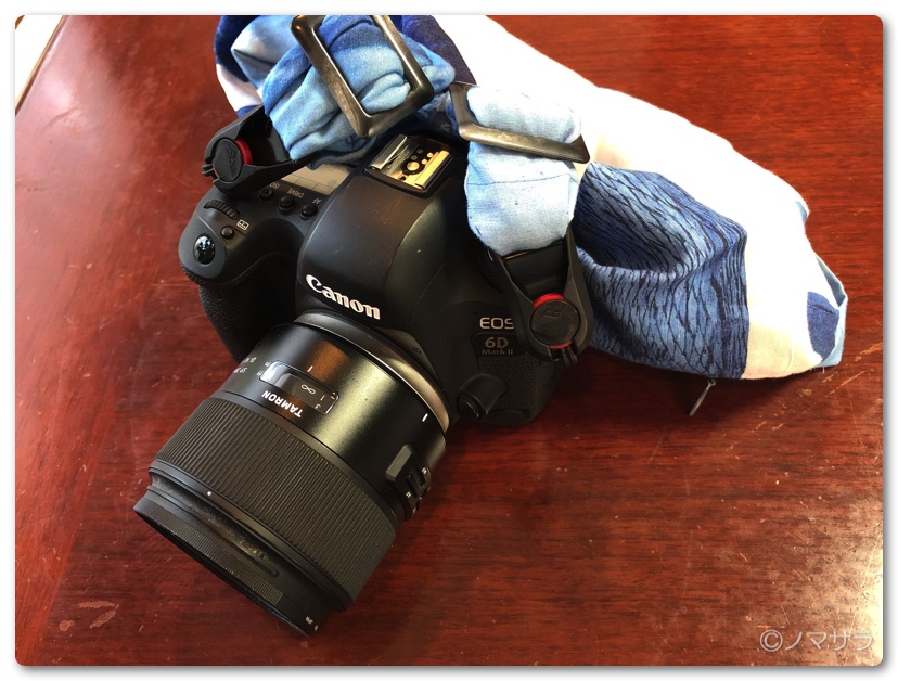 そして、サクラスリング自体が大きなポケットになっているためカメラをしまうことができます。いちいちカバーを持ち歩くことなくカメラとレンズを保護することができるのでとても便利。最近付けっぱなしにしているタムロンの35mmF1.8はもちろん、24-105mmF4ぐらいのズームレンズならすっぽりと包み込むことができます。