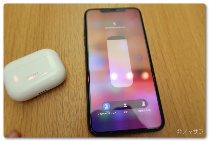 実際に曲を何曲か聴きましたが、AirPodsと比べると断然低音が豊かで音楽を聴くのにも十分な性能があります。ノイズキャンセリング機能はさほど強力ではなく、オフと比べるとノイズキャンセルされているのがわかる程度。静まり返るほどではありませんが必要十分なレベル。AirPodsではポッドキャストぐらいしか聴いてませんが、AirPodsProであれば音楽を聴いても楽しいような気がします。iPhoneの画面からノイズキャンセル機能のオンオフなどをコントロールすることができます。