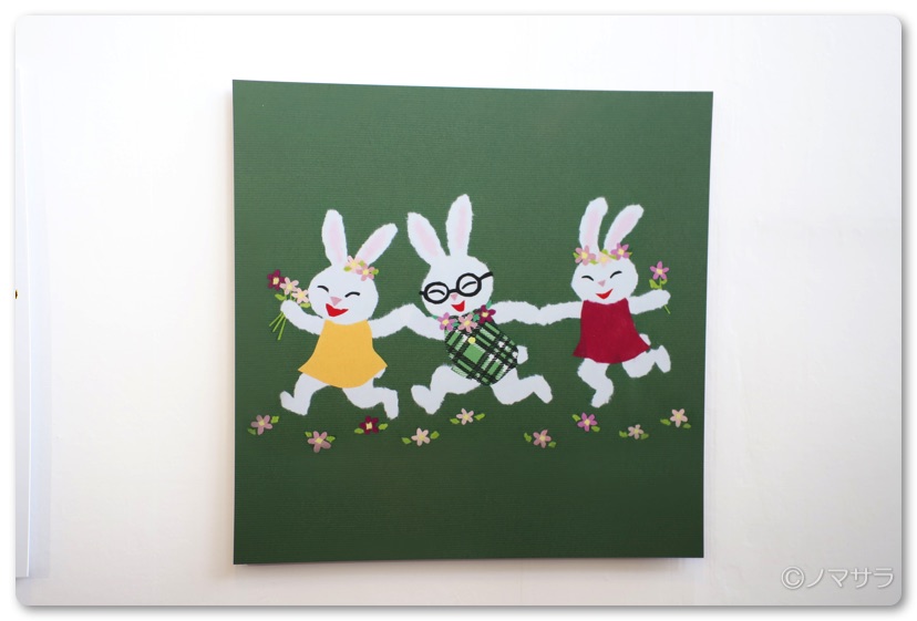 原画が飾ってあり、ちぎり絵の細かな紙の質感などがよくわかります。プリントされた絵本では表現できない細かなところを観ることができて感動しました。カッターナイフで切り抜いた切り絵もありましたが、個人的には手でちぎって作った味わいのある切り絵が好き。