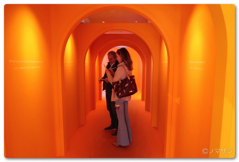 会場は広くはなく、作品点数も多くはありませんがエルメスの底力を見ることができる素晴らしい展示となっていました。最後のコーナーは天井から無数のりんごが吊るされており、出口のある一点から見ると文字が浮かんでくるという遊び心溢れたアートになっています。どんな文字が浮かんで来るのかは現地でのお楽しみにしておきますので文字が浮かび上がった写真は敢えて載せません。