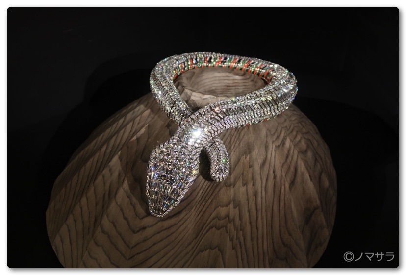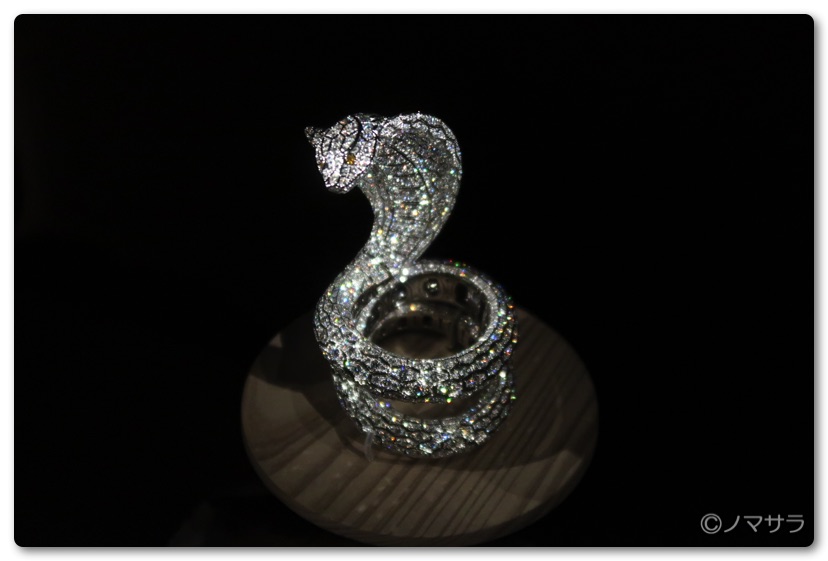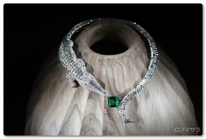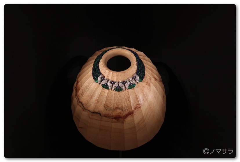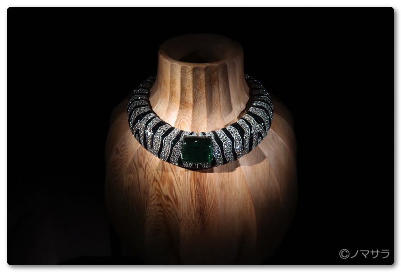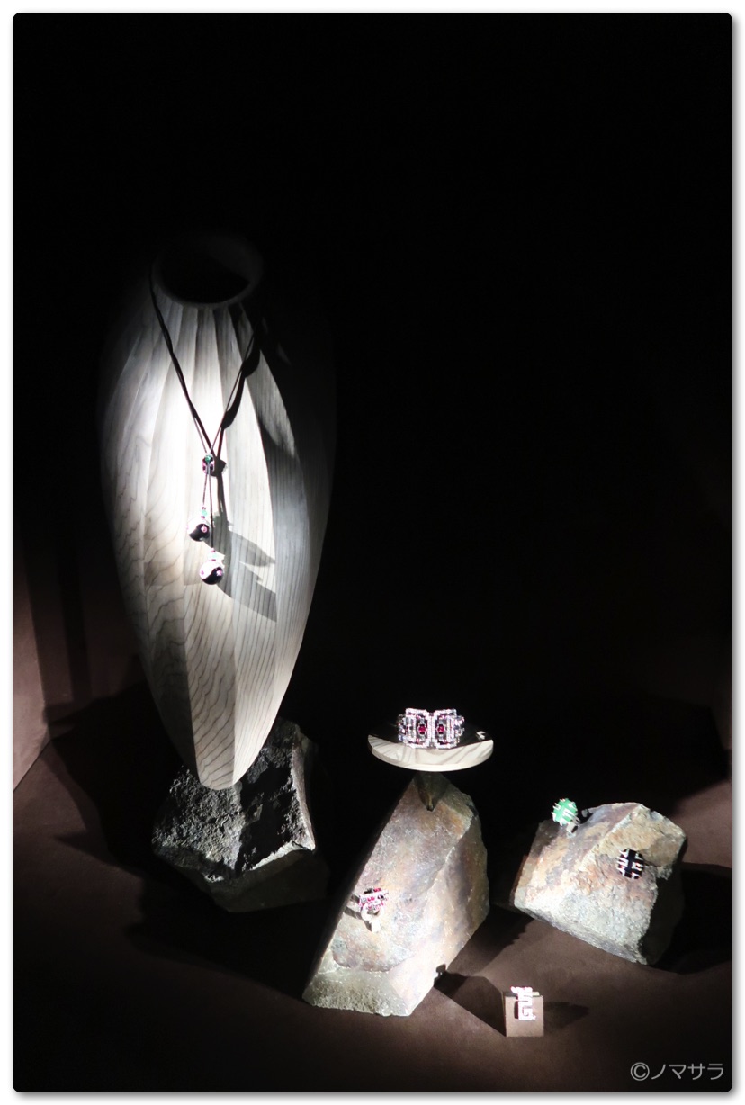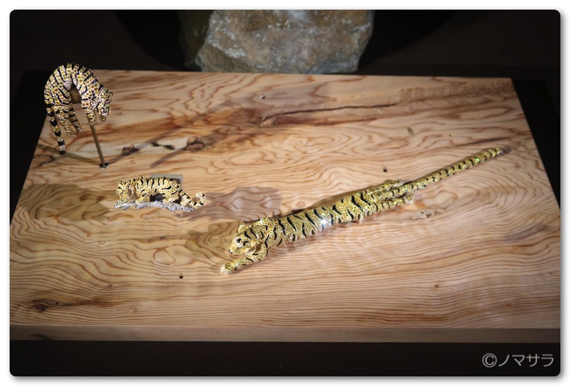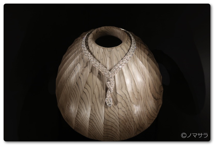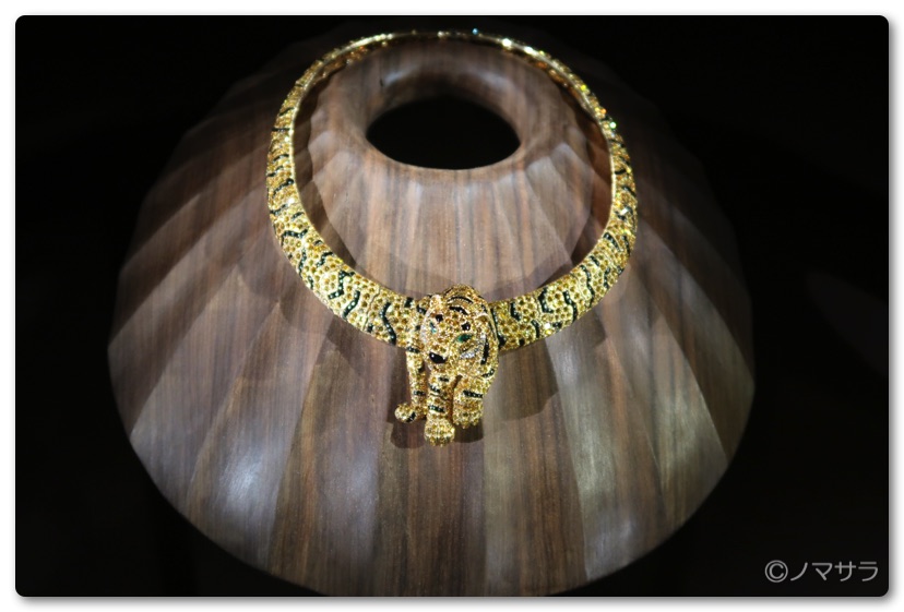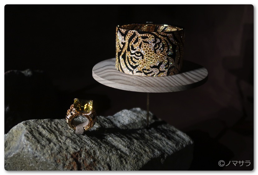 話が脱線しましたが、カルティエのコレクションはどれも素晴らしく女性はもちろん、男性でもその素晴らしさを堪能できます。会場内はすべてのエリアが暗く作品にだけスポットが当たっており幻想的な雰囲気。第3章の「ユニヴァーサルな好奇心」のコーナーのみ撮影可能となっておりました。展示ボックスの内側は日本の伝統様式である漆喰が使われており、作品をより一層引き立たせていました。