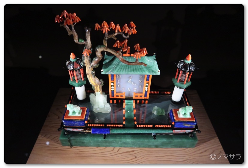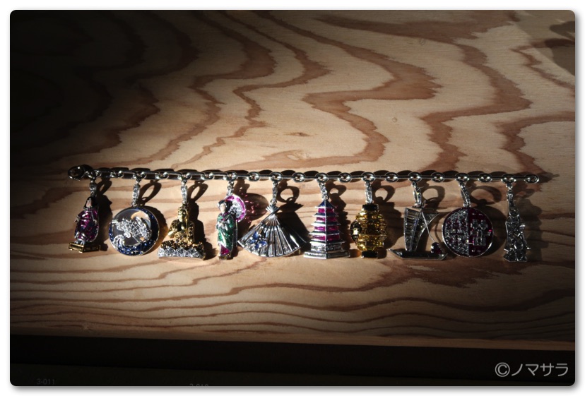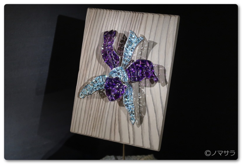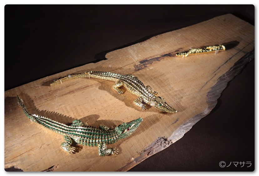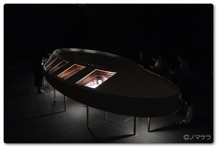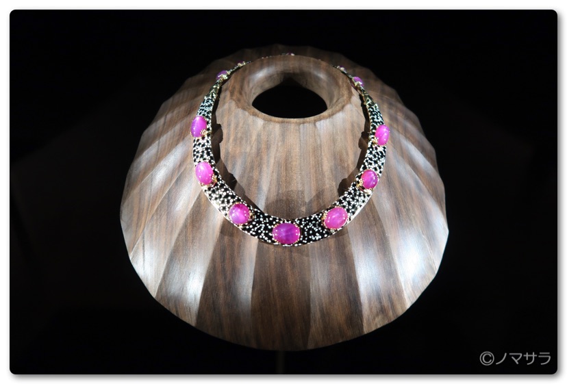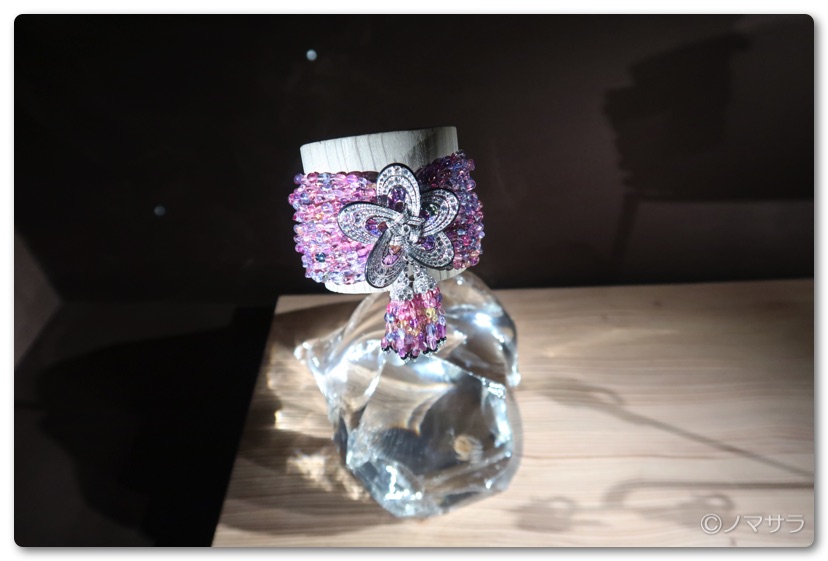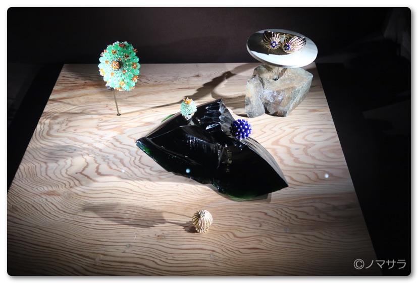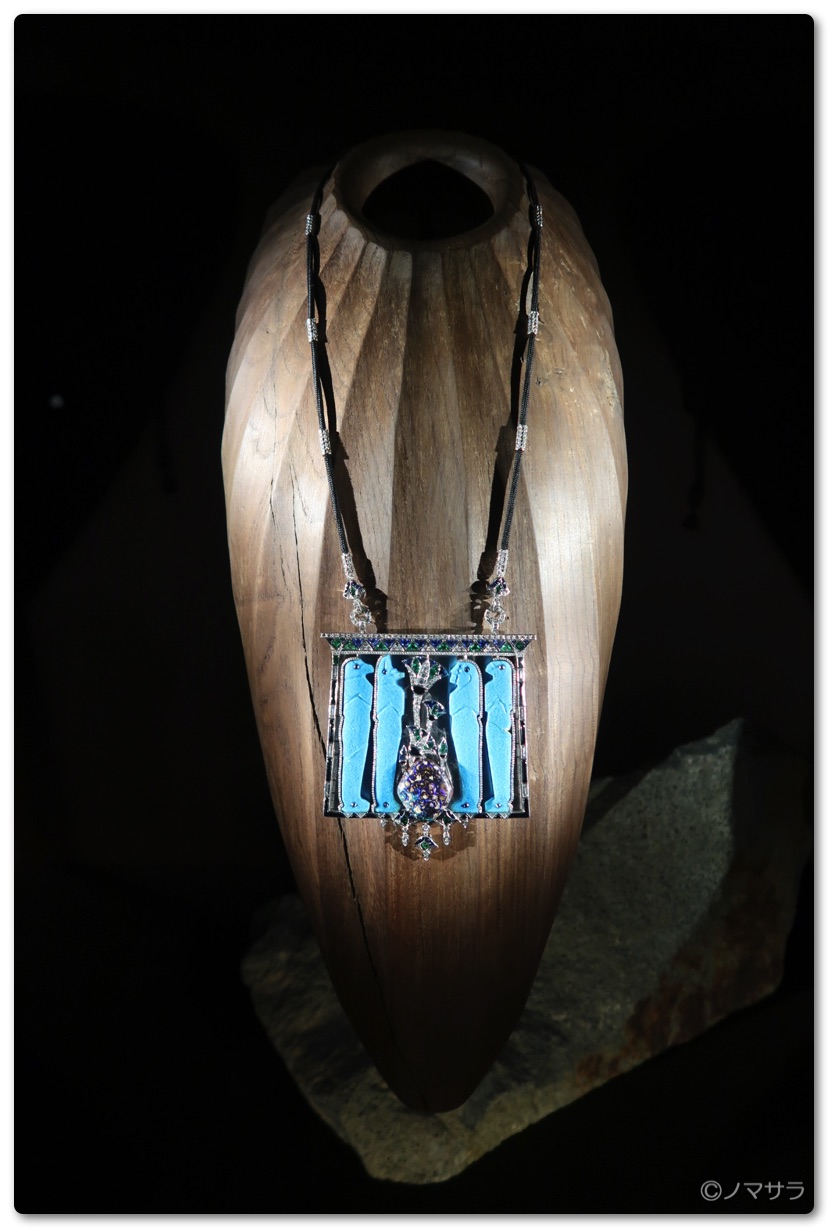 話が脱線しましたが、カルティエのコレクションはどれも素晴らしく女性はもちろん、男性でもその素晴らしさを堪能できます。会場内はすべてのエリアが暗く作品にだけスポットが当たっており幻想的な雰囲気。第3章の「ユニヴァーサルな好奇心」のコーナーのみ撮影可能となっておりました。展示ボックスの内側は日本の伝統様式である漆喰が使われており、作品をより一層引き立たせていました。