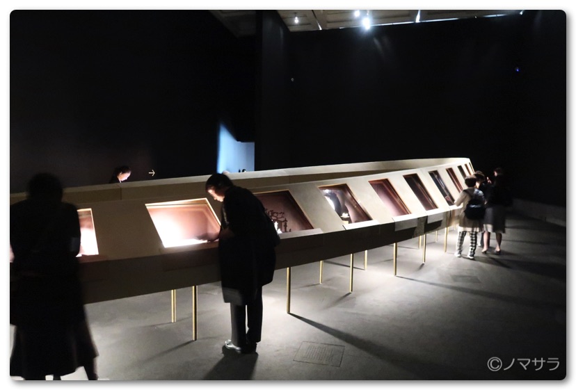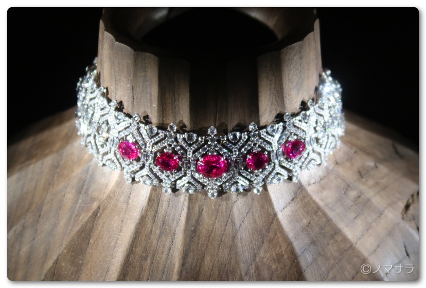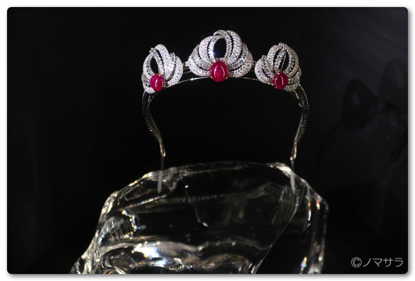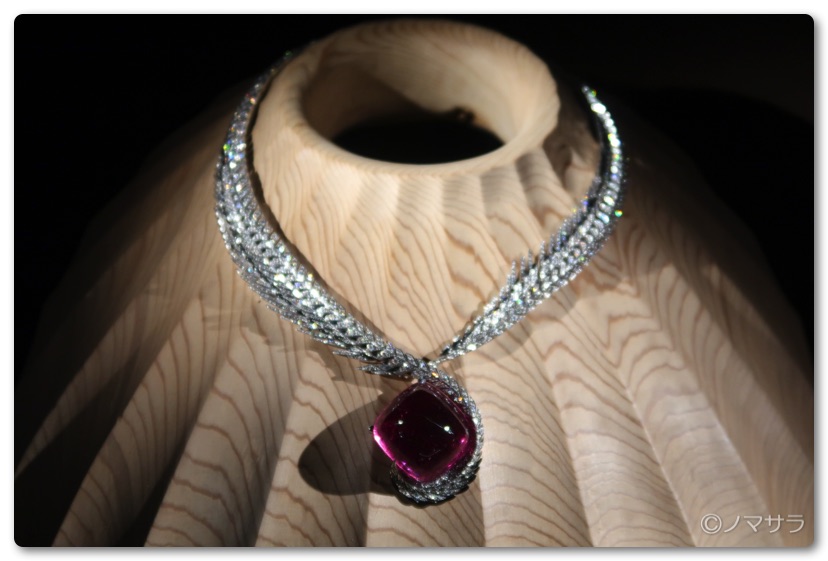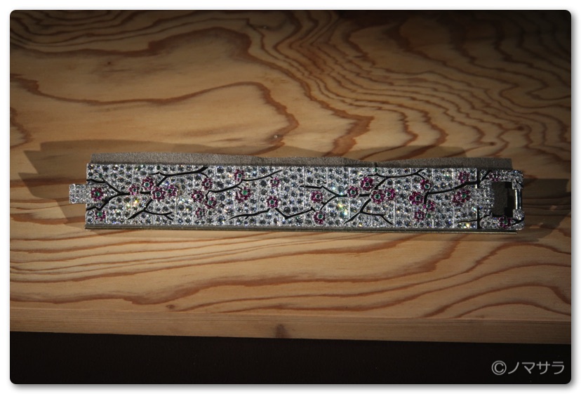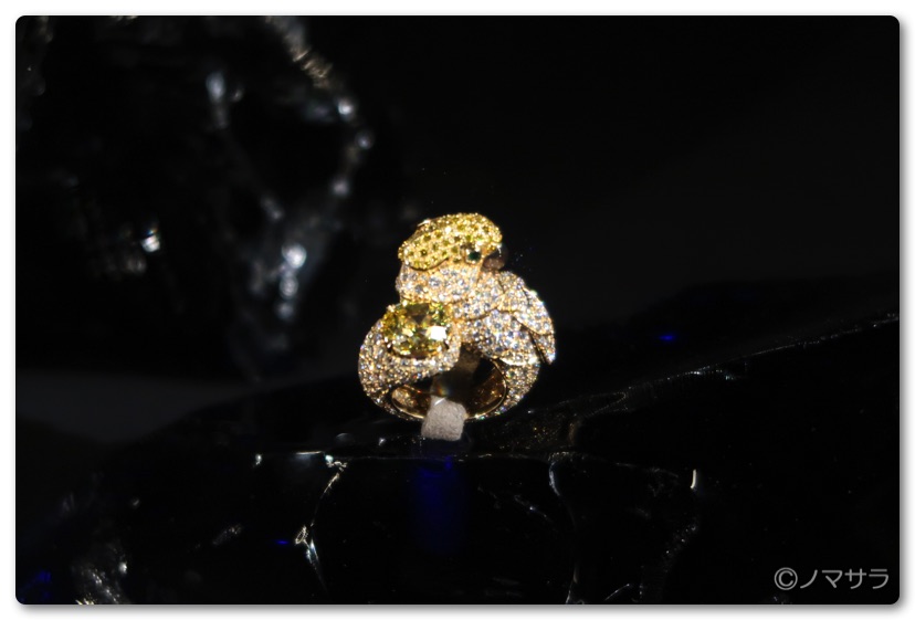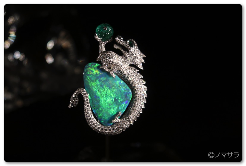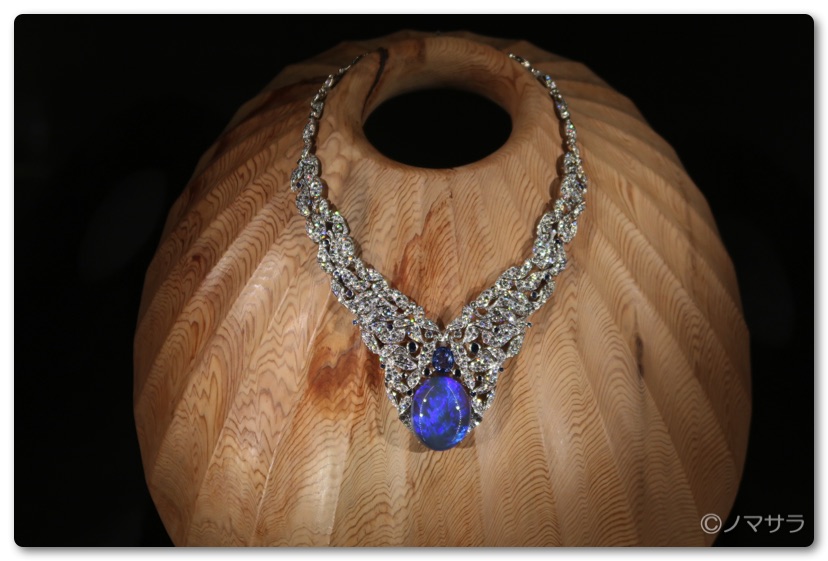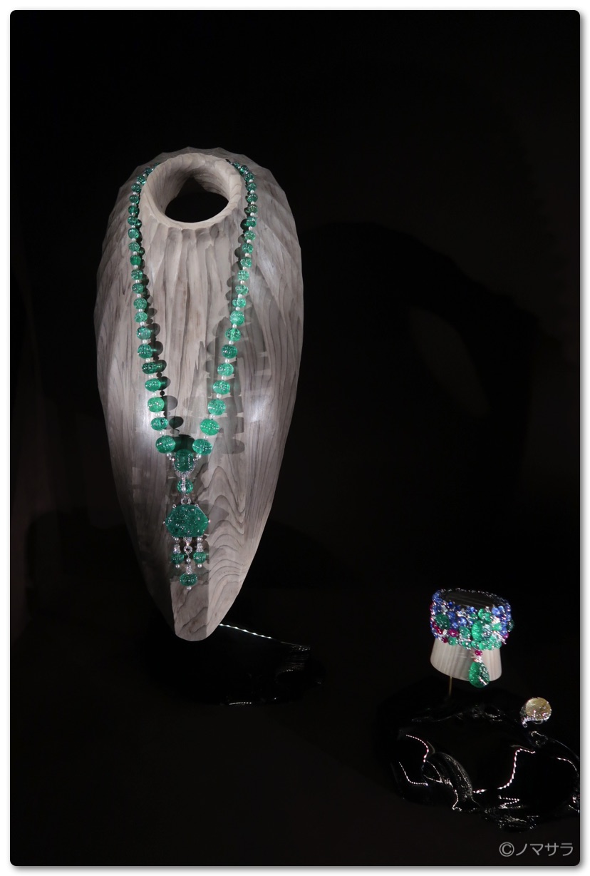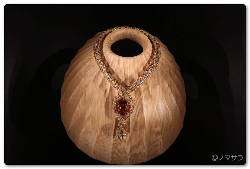 話が脱線しましたが、カルティエのコレクションはどれも素晴らしく女性はもちろん、男性でもその素晴らしさを堪能できます。会場内はすべてのエリアが暗く作品にだけスポットが当たっており幻想的な雰囲気。第3章の「ユニヴァーサルな好奇心」のコーナーのみ撮影可能となっておりました。展示ボックスの内側は日本の伝統様式である漆喰が使われており、作品をより一層引き立たせていました。