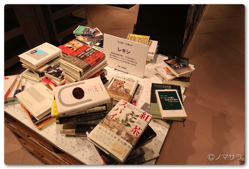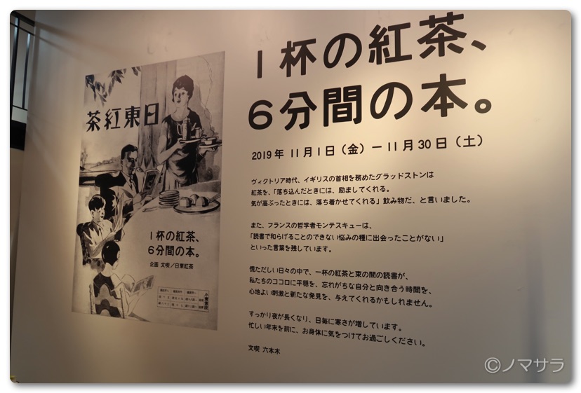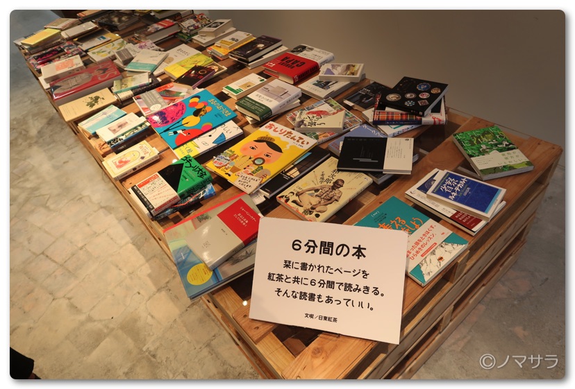 エントランスでは約九十種類の雑誌を販売しています。普段はあまり出会うことのできないラインアップも交え、来店されたお客様の新たな興味の入り口となります。ここまでなら入場料はかかりません。今回は「一杯の紅茶、6分間の本」というテーマで本が並べられていました。一冊ずつ付箋が挟んであり、6分間で読める分量が明示されています。