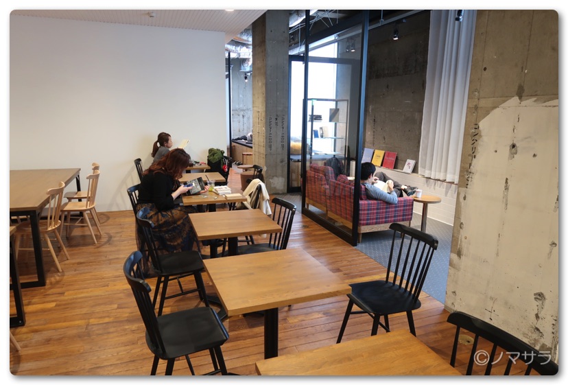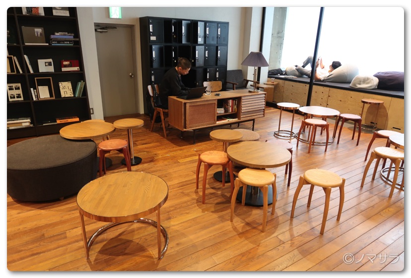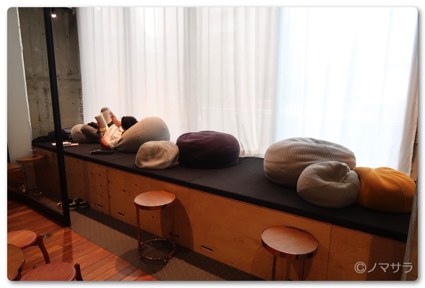 今回訪れたのは平日の15時過ぎでしたが、20名ぐらいの方がおられました。フロアはアップダウンがあり、テーブル席、ソファ席、ビジネスチェア席、人生をダメにするクッション席など様々なスタイルで読書することができます。ドリンクはコーヒーや紅茶やほうじ茶などは無料で飲むことができます。また有料ですが軽食もあり一日過ごすことも可能。