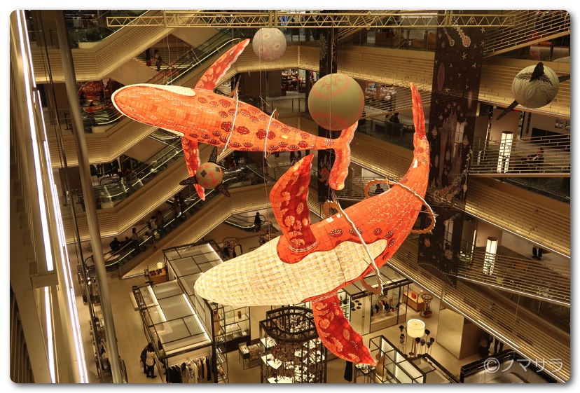 今回はフィンランド人アーティストであるクラウス・ハーパニエミ氏の「Celebration of Life -星の海の祝祭-」と題したクリスマスプロモーションが展開されています。宇宙を舞台に描かれた作品『Astral Sea(アストラル・シー)』の世界をGINZA SIXのためにアレンジし、GINZA SIXの象徴的な中央吹き抜け空間に巨大アートを展示。吹き抜けを巨大なシロナガスクジラが悠々と泳いでいるかのよう。