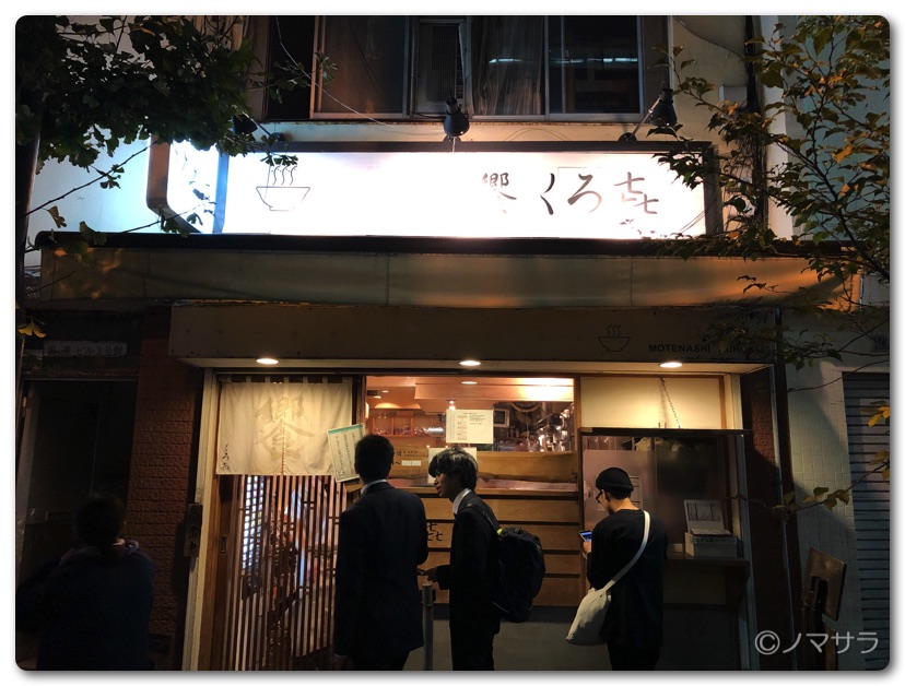 そして2日目の夕食は秋葉原と浅草橋の中間地点にある「饗 くろ㐂」へ。Googleマップでの評価が4.1点でクチコミ数は902件、食べログでの評価は3.91でクチコミ数は807件(2019.11.18現在)と美味しい条件としては必要十分。期待が膨らみます。店舗は秋葉原駅の高架沿いを歩いて8分ほどの場所にありますが19時過ぎに到着したら6名ほど並んでいました。まず食券を購入してから列に並ぶルールになっています。