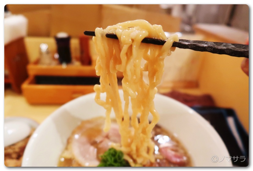 手もみ麺はモチモチの食感と小麦の香りが素晴らしくめちゃウマ。スープと相性もよく完璧な組み合わせ。ただし、細麺も美味しいような気がします。