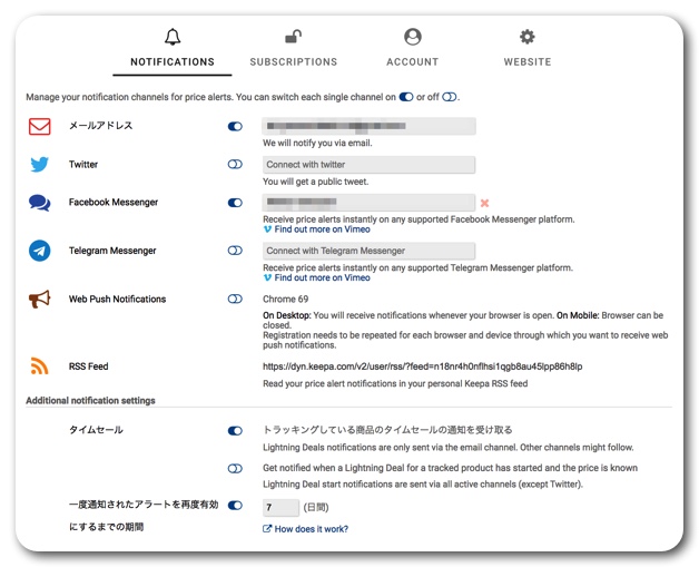 この「Keepa」が便利なのは気になる商品を登録して、価格を指定しておけば、その値段になったらメール・SNSで通知してくれる点。指値で金額を指定することもできますし、20%以上下がったらという指定も可能。セール期間中でも、本当に安くなっていて狙い目なのか、実はそんなに安くなっておらず少し待った方がいいのかがすぐにわかります。Keepaでチェックしていればお得なタイミングで購入することができます。メール通知もできますが、素早く情報を受け取れるようFacebookメッセンジャーに通知が来るように設定してあります。
