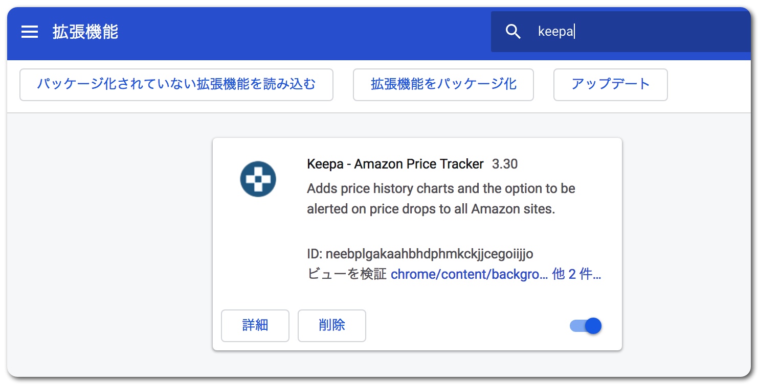 検索窓に「Keepa」と入力。「Keepa」が出てきたらオンにすれば拡張機能が有効になります。
