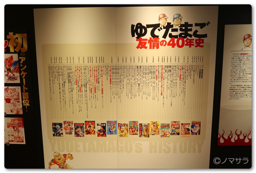 会場では、最新作までのカラーイラスト、貴重な原画などが100 点以上を展示されています。そのほか「ゆでたまご先生の歴史」「キン肉マンと闘った超人たち」「命をかけた闘いの軌跡」「友情パワー」「新章新たなる闘い!」「懐かしいお宝グッズ」「フォトスポット」など、ファン必見の展示の数々を楽しむことができます。「ロビンマスク」「バッファローマン」「ウォーズマン」「テリーマン」など懐かしいキャラクターに出会うことができました。原画をすべてじっくり見ると2時間近くかかりますが、ササッと流せば40分ほどで鑑賞可能。