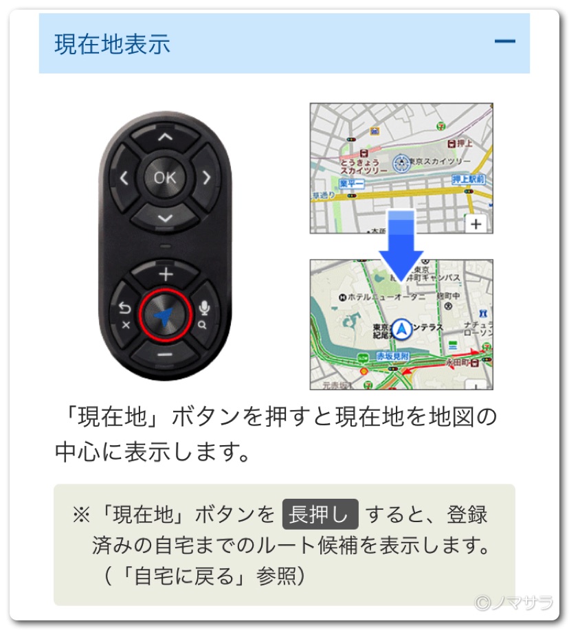 現在地ボタンを長押しすると登録済みの自宅までのルート候補を一発で表示してくれます。