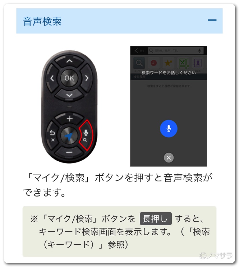 運転しながら場所を入力したい場合、スマホをタッチするのはとても危険。そういう場合は下エリアの右の「マイク/検索」ボタンを押すと音声入力で検索することができます。