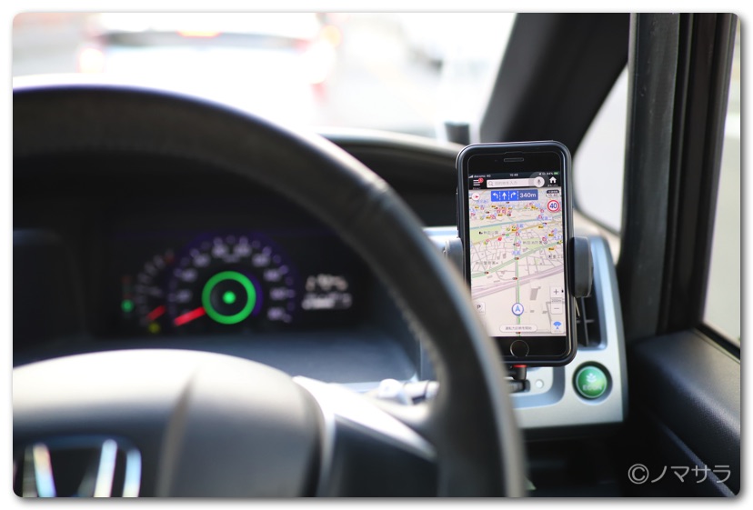 iPhoneのホルダーはMountek AIRGRIPを使っています。夏場はダッシュボードに設置するタイプだと熱暴走しますが、これはエアコン吹出口にセットできるため常に空冷されるためとても便利で重宝しています。やや保持力が弱いので接続部分に両面テープをつけて利用しています。