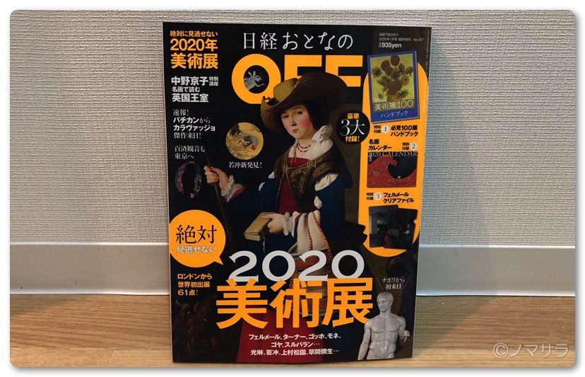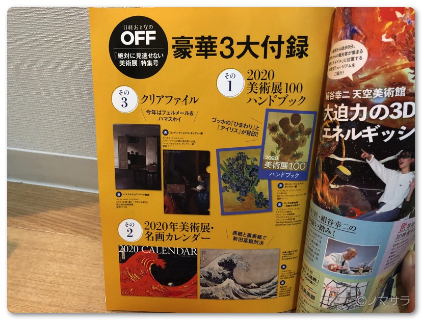 「毎年年末恒例、この時期に発売される日経おとなのOFFの美術展特集。今年は絶対見逃せない2020美術展」ということで様々な特集が組まれています。935円と普段より値段はしますが、内容が充実しているとともに豪華?3大付録が付属しています。