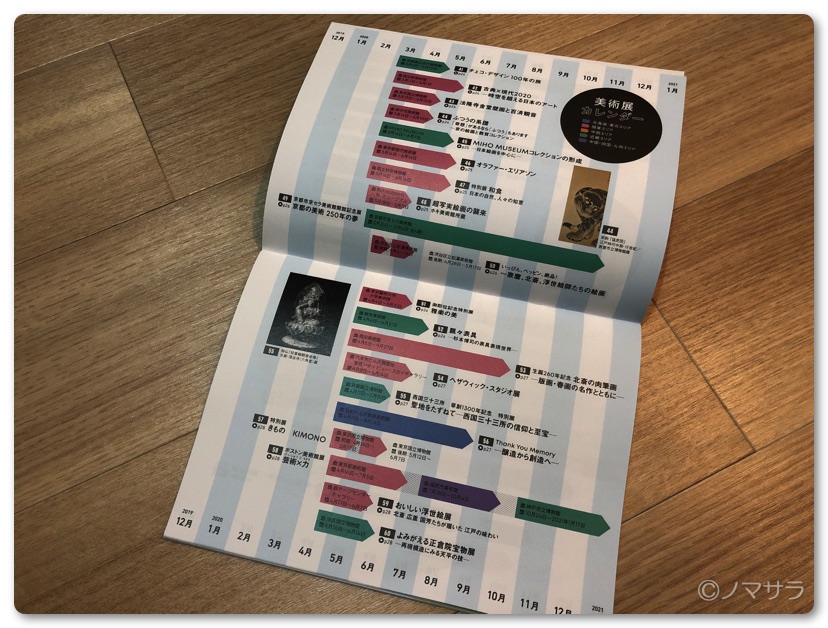 まず1つ目は必見100展ハンドブックで全国各地の美術館のスケジュールがガントチャート形式のカレンダーで閲覧でき、それぞれの美術展の概要が記載されています。これさえあれば主な美術展を見逃すことはありません。