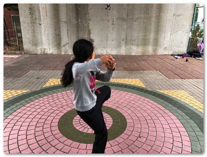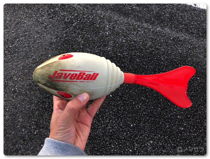 練習は野球のボールやテニスボールでもいいのですがオススメはジャベリックボール。細長いラグビーボールの後ろに羽がついたような形をしており、着地した後に転がらないので効率よく練習ができます。