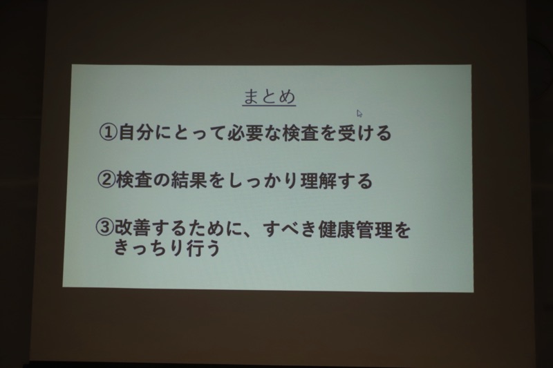 その後本題に入り、まずは健康診断と人間ドックの違いについて。健康診断は法定診断、人間ドックは任意診断であり、人間ドックを受けたからといって寿命が延びるわけではありません。お金を出しても健康を買うことは出来ず裏道もありません。健康リテラシーが低い人はエセ科学に引っかかりがち。少し前に話題になった血液クレンジングだとか、水素水、ふくらはぎを揉むなど…。どれも効果はありません。