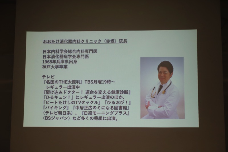 後半は美崎栄一郎さんの検診結果を基にメタボリックシンドロームのお話をされました。ウエストが男性85cm、女性90cmを超えたらメタボと言われますが実はこれだけではメタボリックシンドロームとは言い切れません。メタボは内臓脂肪が多い状態かつ血圧、血糖、脂質の3つのうち2つ以上が正常値から外れていると確定となります。大竹医師のお腹もかなりのぼっちゃりですが血圧、血糖、脂質は正常値のためメタボリックシンドロームではないとのこと。