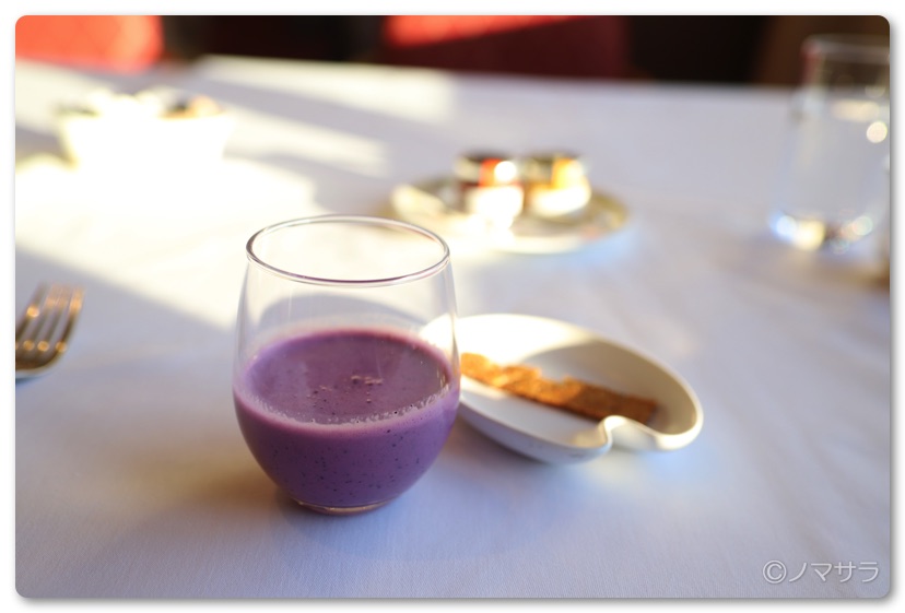 ブルーベリースムージーは濃厚で粒状感があり、味、香りとも抜群で激ウマ。一緒についてきたパリパリの何かがこれまためちゃウマ。