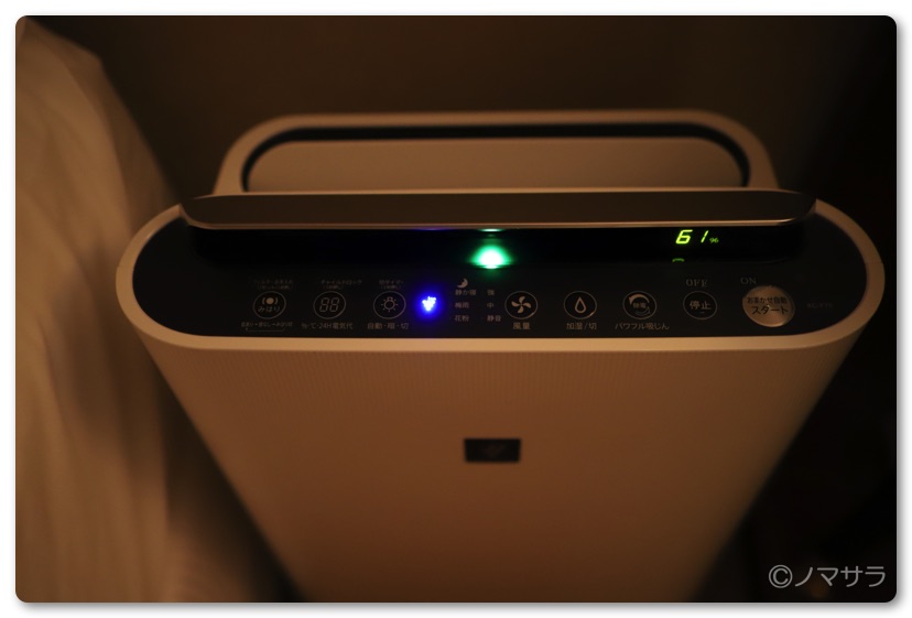 ベッドの横にはシャープのハイクラスの空気清浄器が置いてあり空気をクリーンな状態に保ってくれます。冬場は空気が乾燥するのでバスタブに湯を張ってドアを開けたままにして湿度を上げて喉を傷めないようにしています。