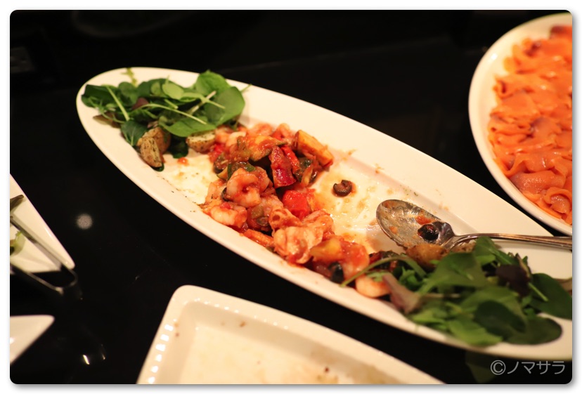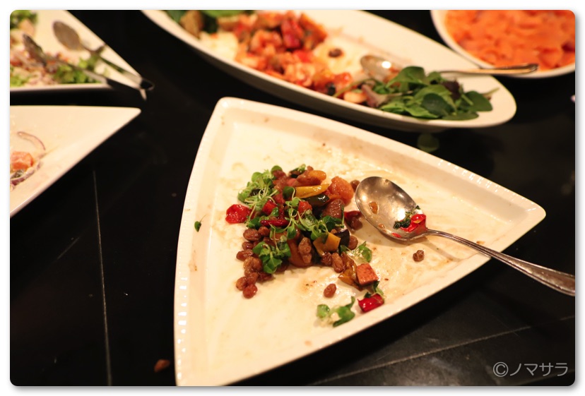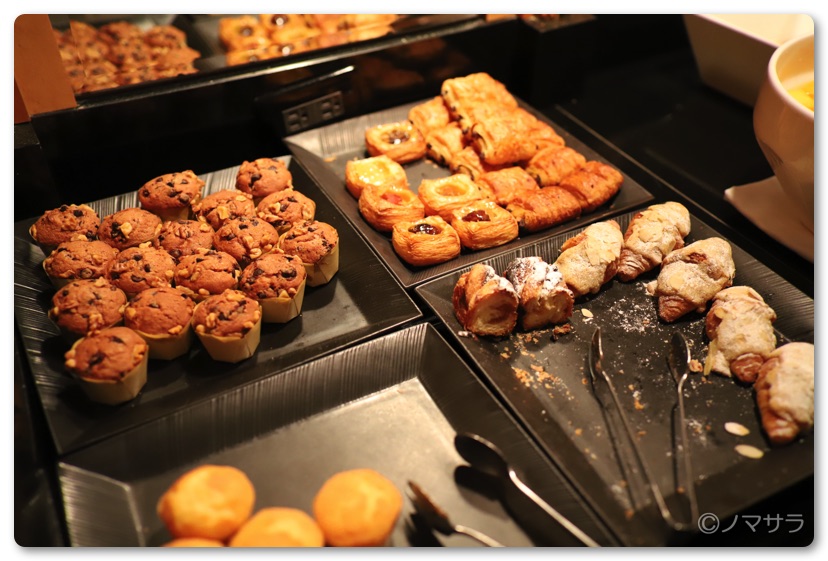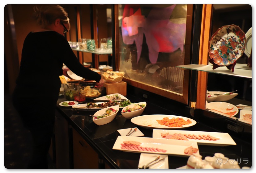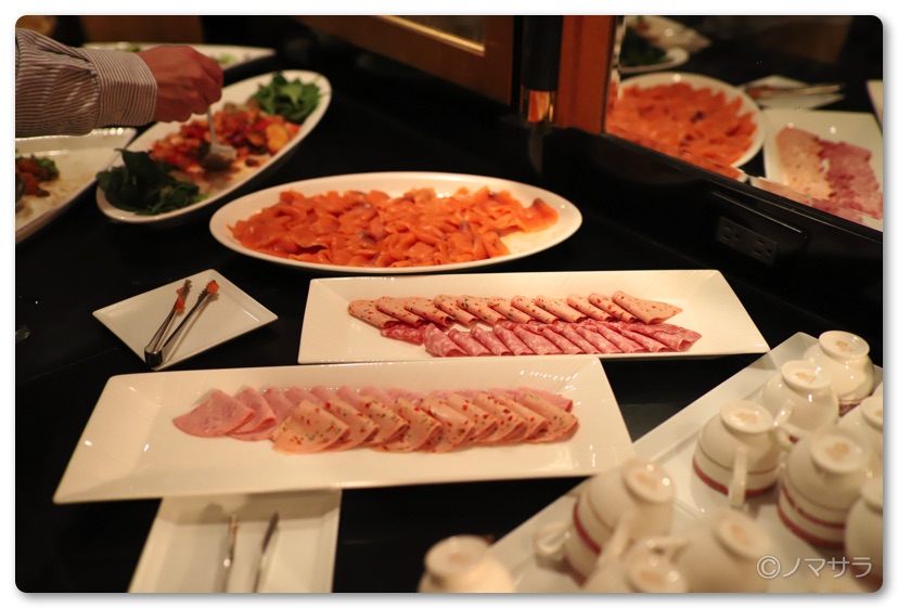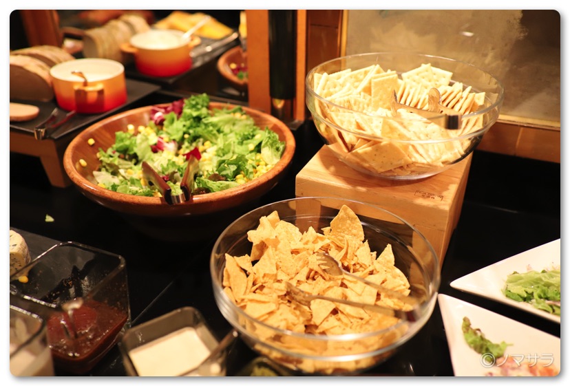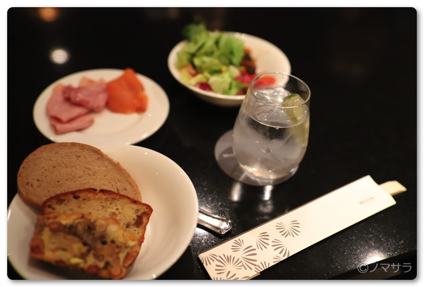 部屋に荷物を置いてまずはクラブラウンジへ。ここではハムやチーズ、サラダ、スープ、パンのほか、アペタイザーなどの軽食が並んでおりお腹を満たすには十分。どれも美味しく味も折り紙付き。特にチーズやハム、スモークサーモン、パンプキンスープが美味しく、アルコールを飲む方ならワインと一緒に楽しめば大満足間違いなし。ケーキなどのデザートもありますが甘いものを食べないので今回はスルーしました。スイーツが好きな方であればさらに満足度は上がるはず。