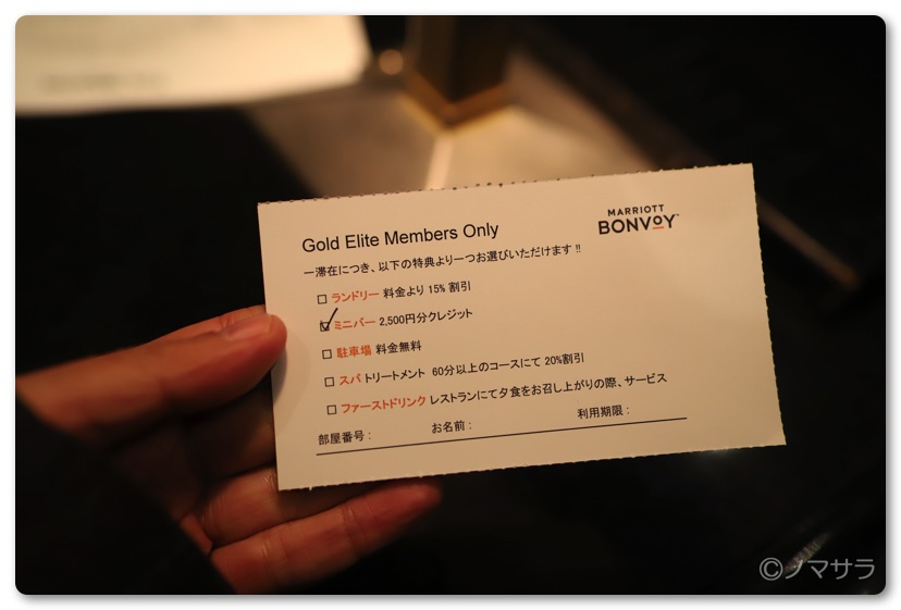 今回は18時にチェックイン。今回はゴールドエリートメンバー特典として5つのサービスがありましたが、今回はミニバー2,500円分のクレジットを選択。何に使ったかは後ほど。