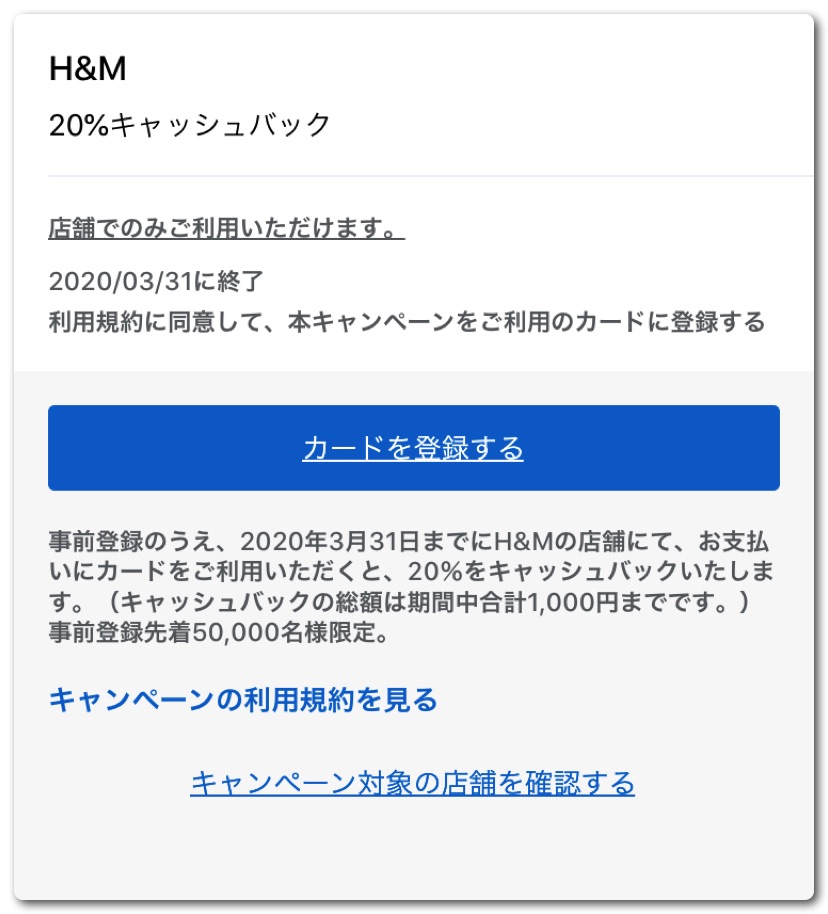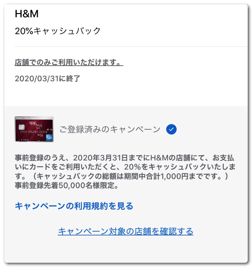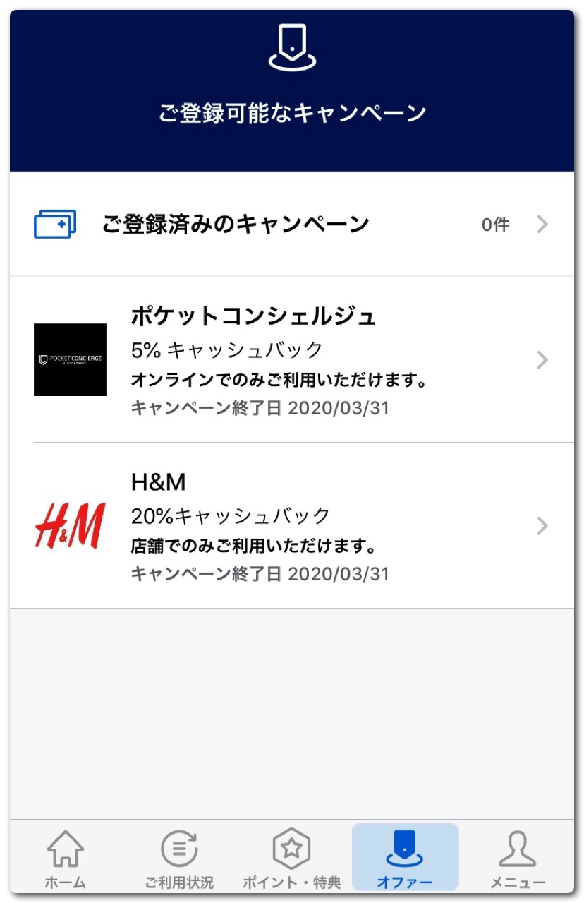 そして見逃してならないのは「オファー」の項目。ここにはアメックスのキャンペーンが一覧で出てきます。これに登録しておけば様々な特典を受けることができます。現在、掲載されているのはポケットコンシェルジュの5%キャッシュバックとH&Mの20%キャッシュバックの2つ。H&Mは単価が安いからか上限は1,000円までとなっており5,000円分の買い物までなら20%オフの特典を享受することができます。先着5万名様までなので使うかどうかわからなくてもとりあえず登録しておくことをオススメします。