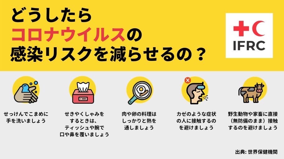 世界保健機関による新型コロナウイルスをはじめ、インフルエンザなどのウイルスの感染リスクを減らす方法は下記の通り。