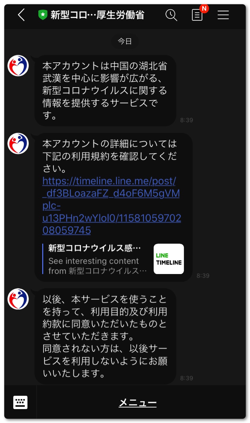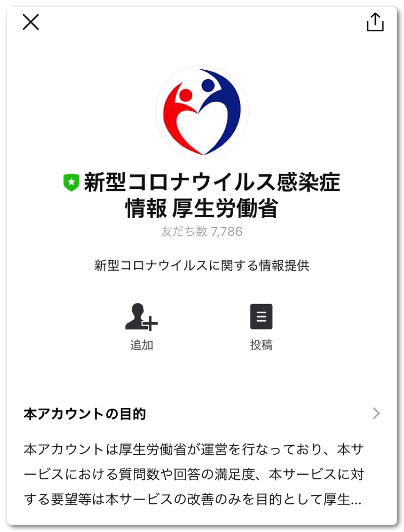 「新型コロナウイルス関連情報」という厚生労働省のアカウントが出てくるので友達追加