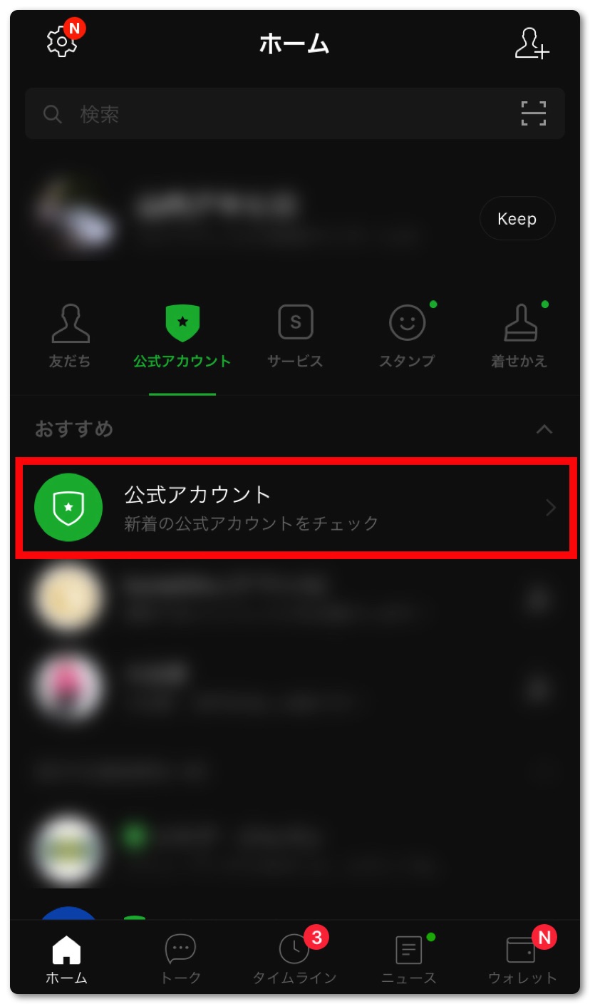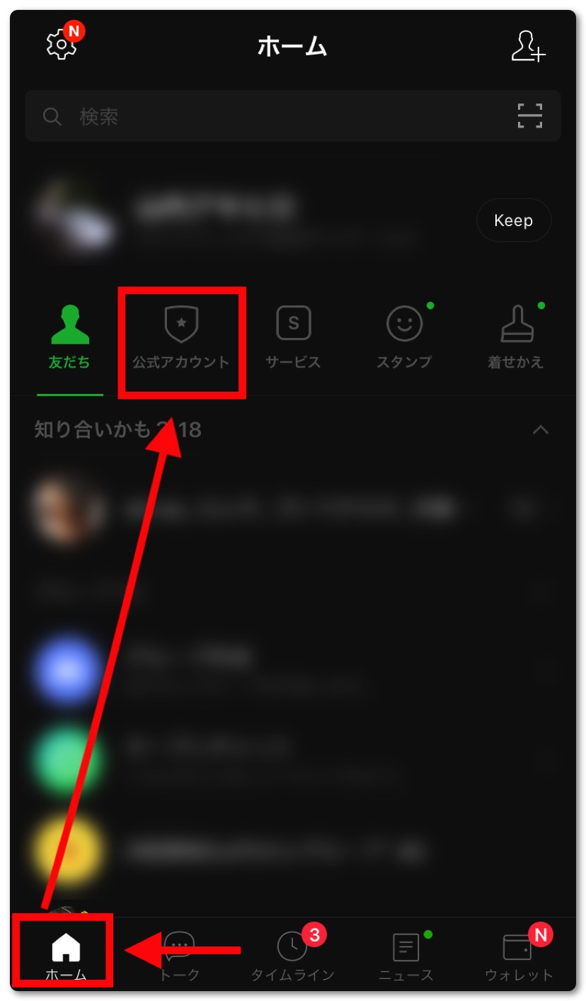 LINEを起動して左下のホームをタップし、公式アカウントをタップ