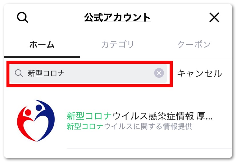 検索窓に「新型コロナ」と入力。「新型コロナウイルス関連情報」という厚生労働省のアカウントが出てくるので友達追加