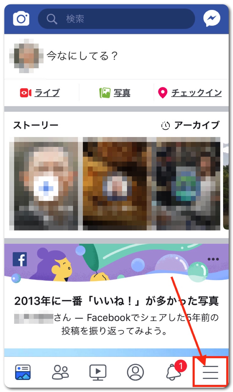 Facebookアプリ右下の三本線のアイコンをタップ。その後下へスクロールします。