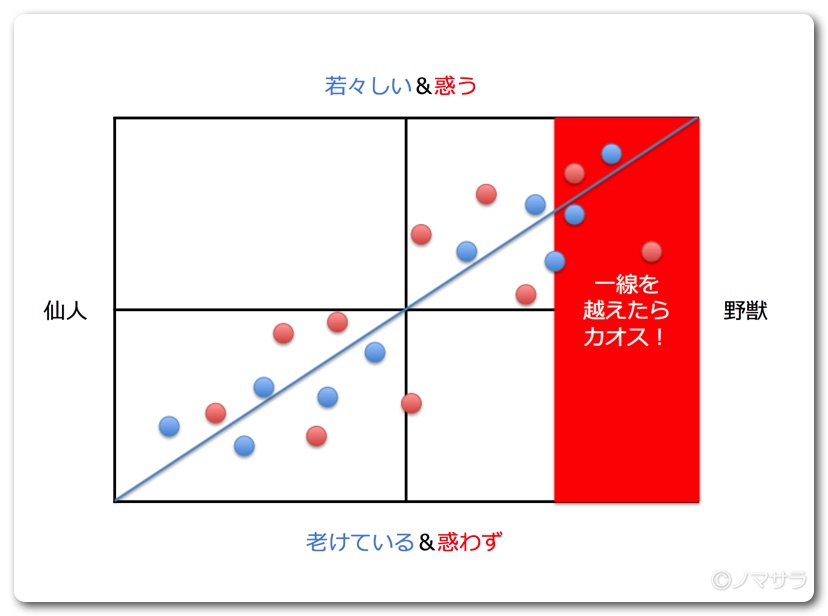 今回、K氏がヒアリングした方々を四象眼のマトリックスにプロットしてもらいました。横軸には「野獣」(女性に興味あり)「仙人」(女性に興味なし)、縦軸には2種類、それぞれ「若々しい」「老けている」というのと「惑う」「惑わず」を置きます。この手の象眼はマーケティング理論などでよく使う手法。