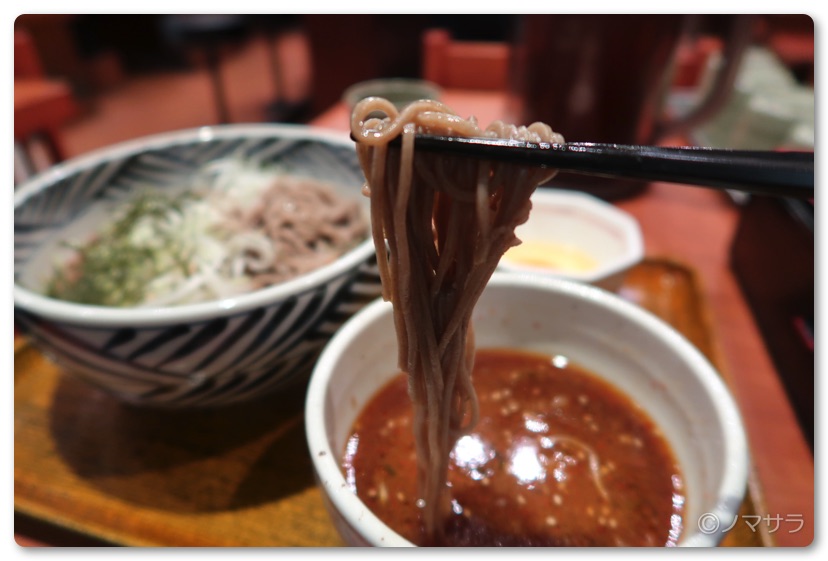蕎麦と牛肉、白髪ネギをいい具合に箸で掴んでつけ汁に投入し、食べたら激ウマ。