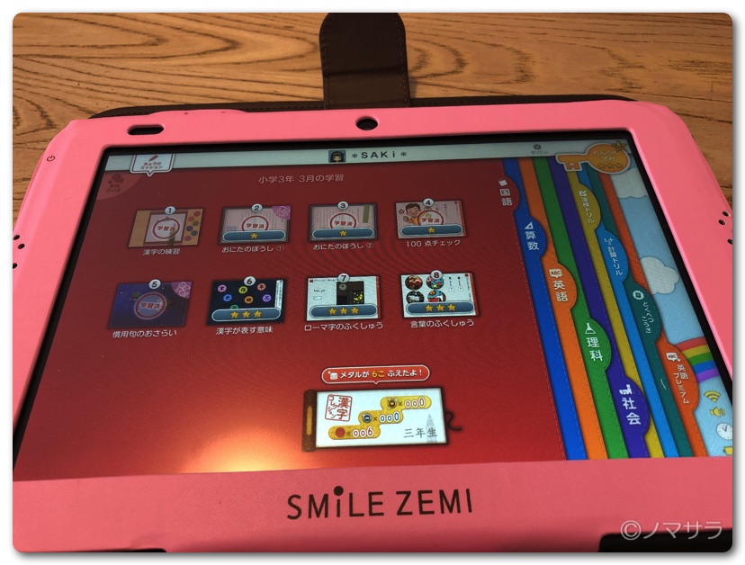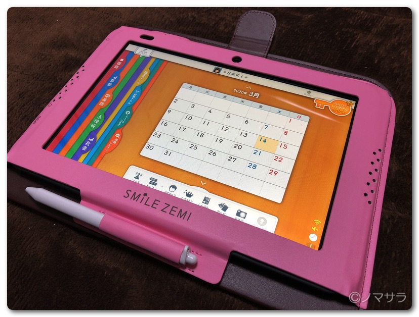 スマイルゼミのタブレットは10インチのAndroid端末ですが完全にカスタマイズされており他のアプリは一切使えません。トップ画面にはカレンダーがあり、勉強したログがここで確認できます。左側にあるタブで各教科を選択します。