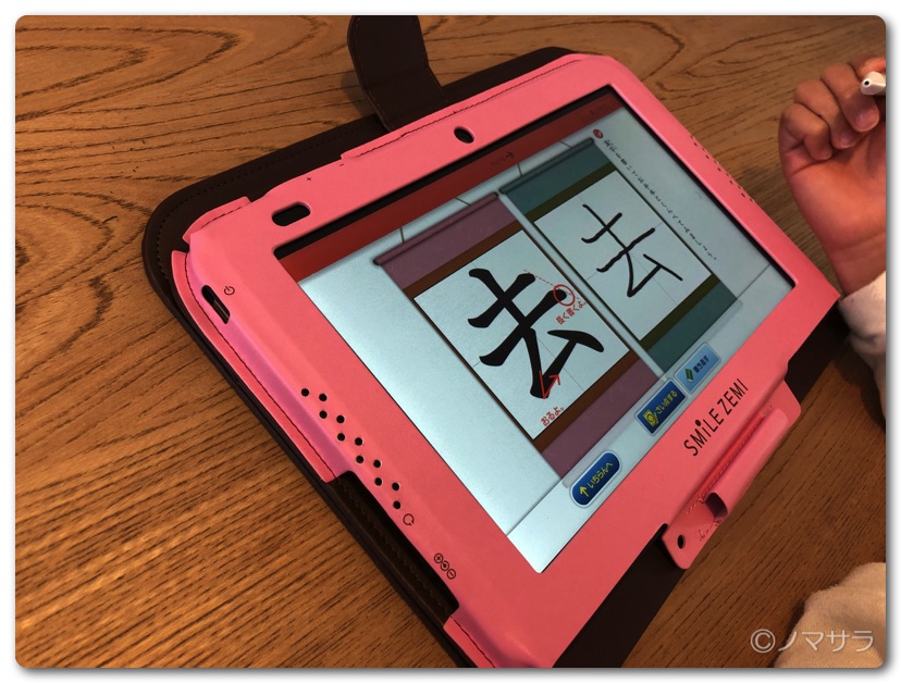専用のペンにより手書きで直接画面に書き込むことができます。反応速度はiPadProなどと比べると若干遅いような気がしますが気になるほどではなく、使用に問題はありません。漢字の練習はなぞったものがそのまま反映され、差分を判断して上手い下手を判定してくれます。