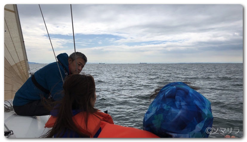 ヨットオーナーの指示の下、舵を巧みに動かしながら風を捕まえて前に進みます。出港したときはほとんど風がなかったのですが沖に出るとちょうどいい具合に風が吹いてきてかなりのスピードで進むことができました。