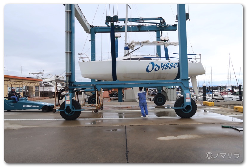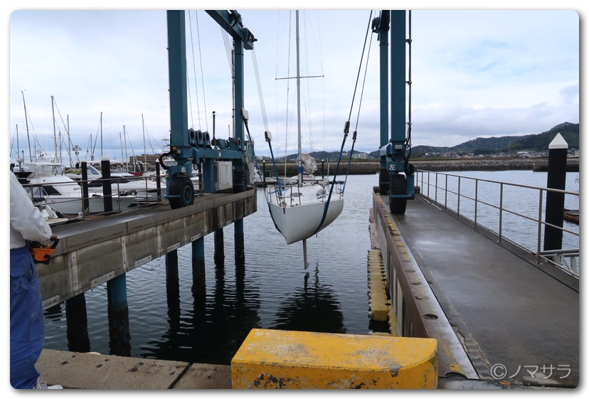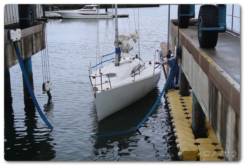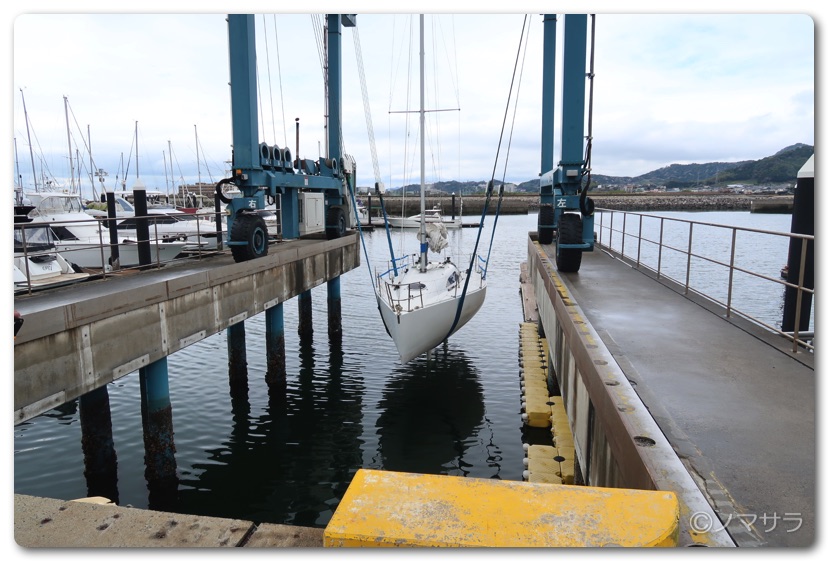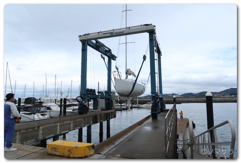 3時間半遅れで蒲郡の三河みとマリーナへ集合し、ヨットを陸から海へ移動するところから見学しました。ヨットは水中に置いておくと貝などが付着するため一回ずつ陸に上げなければなりません。台座を海際へ移動させた後、大きなクレーンで釣り上げて着水させます。