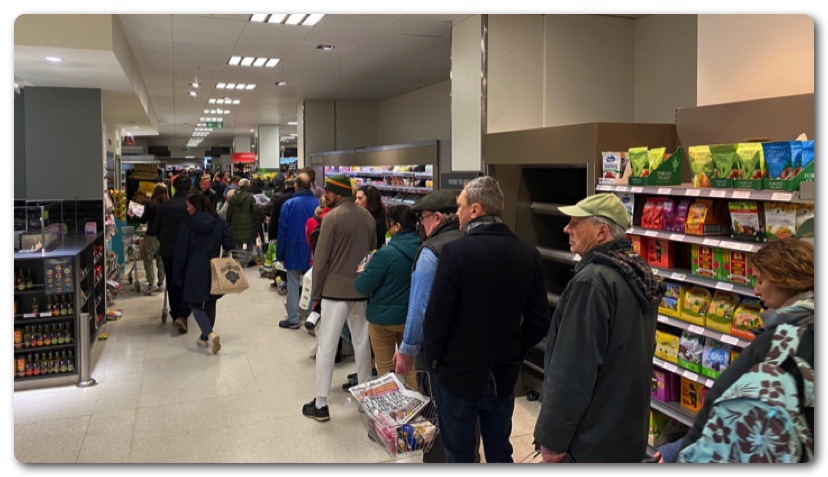 もし一人でも感染者がいた場合、レジスタッフが商品を手で触ってカゴに入れ、その手でまた次の客の商品を触ってカゴに入れ…という状態が続きウイルスが次々と撒き散らされることになります。本来であれば一回ずつ手袋を交換して、その都度アルコール消毒をする必要がありますが大混雑の中それができるとは思えません。
