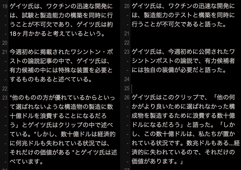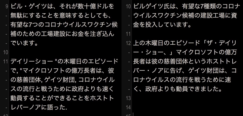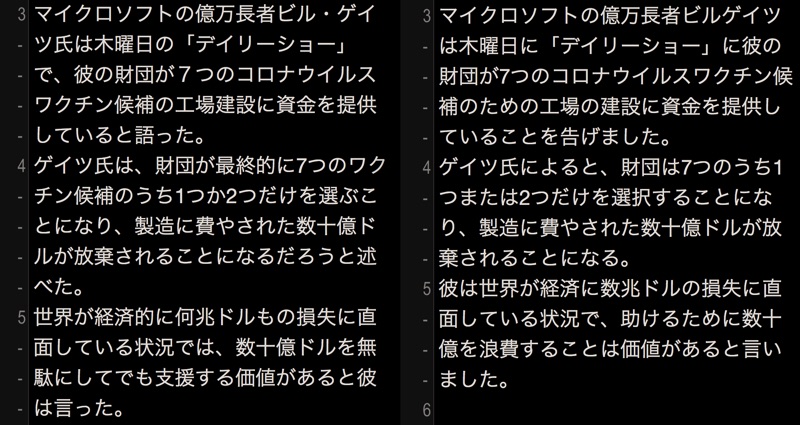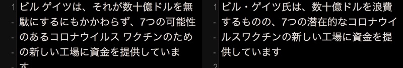 今回はビル・ゲイツ氏が新型コロナウイルスのワクチンのため数十億ドルの資金を提供するというニュースをDeepL翻訳とGoogle翻訳で比較してみました。左側がDeepL翻訳、右側がGoogle翻訳になります。まずはタイトルから。