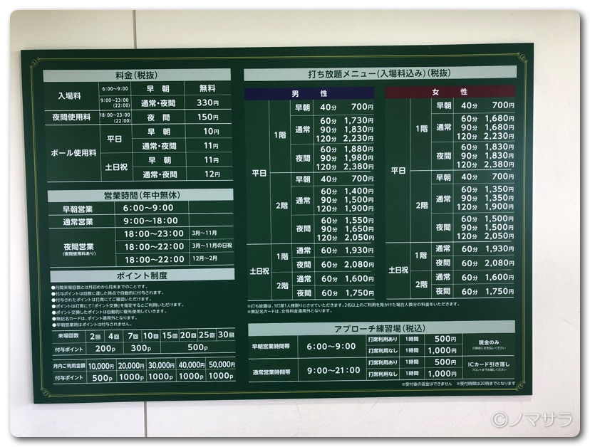 受付が9時からオープンし、アプローチの練習を申し込みました。打席で練習した場合は1時間500円、アプローチだけ利用の場合は1,000円になりますので、アプローチを練習する場合は軽く打席で練習してから利用することをオススメします。