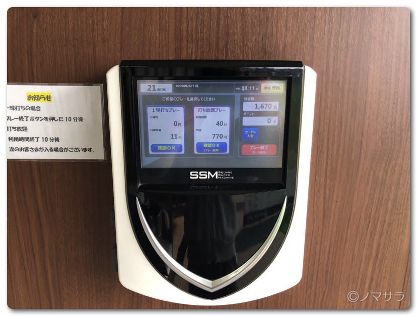 ATMでICカードを購入しいくらかチャージします。それを打席横の機械に差し込んでメニューを選択すればOK。